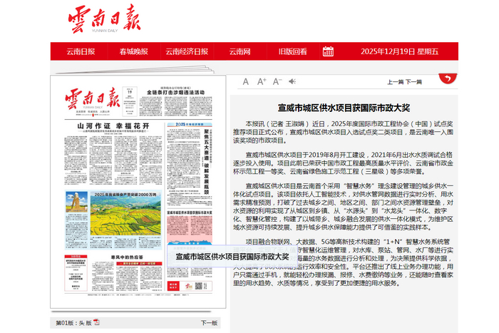 《云南日報(bào)》頭版:宣威市城區(qū)供水項(xiàng)目獲國際市政大獎(jiǎng)